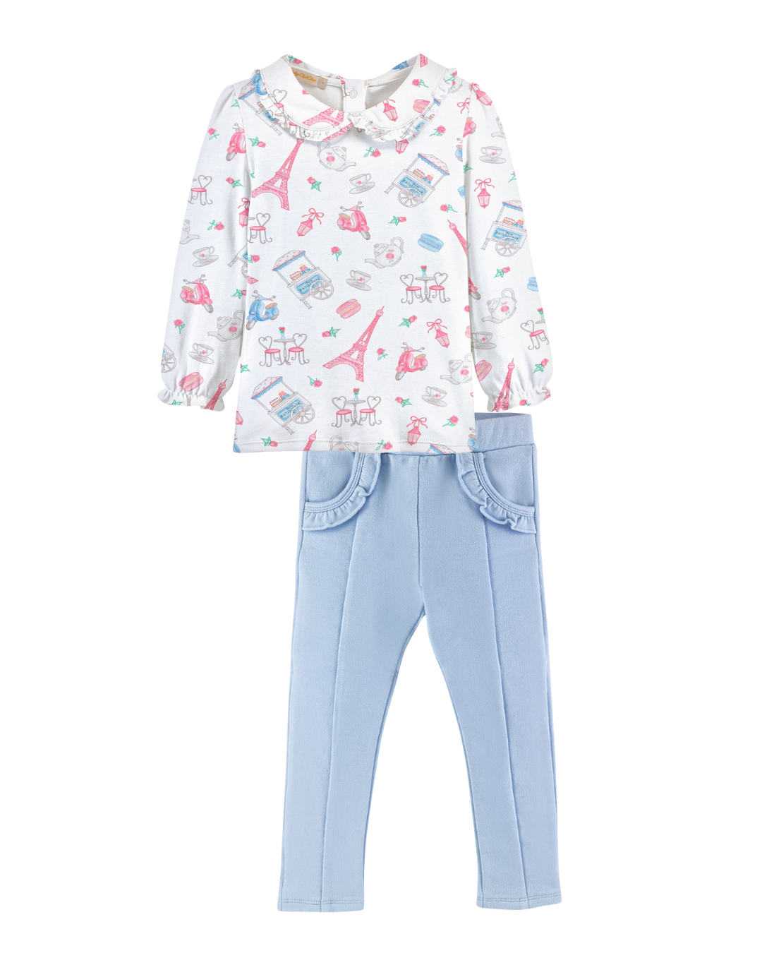 Wrap your little one in the softest pima cotton with this adorable Charming Tea Collared Shirt and Pants Set. Featuring a sweet tea time in Paris print on a pima long sleeve shirt with a ruffled round collar and light blue French Terry pima pants with ruffled pockets, it’s perfect for playful days. Comfortable and cute, this set makes dressing up fun and easy!