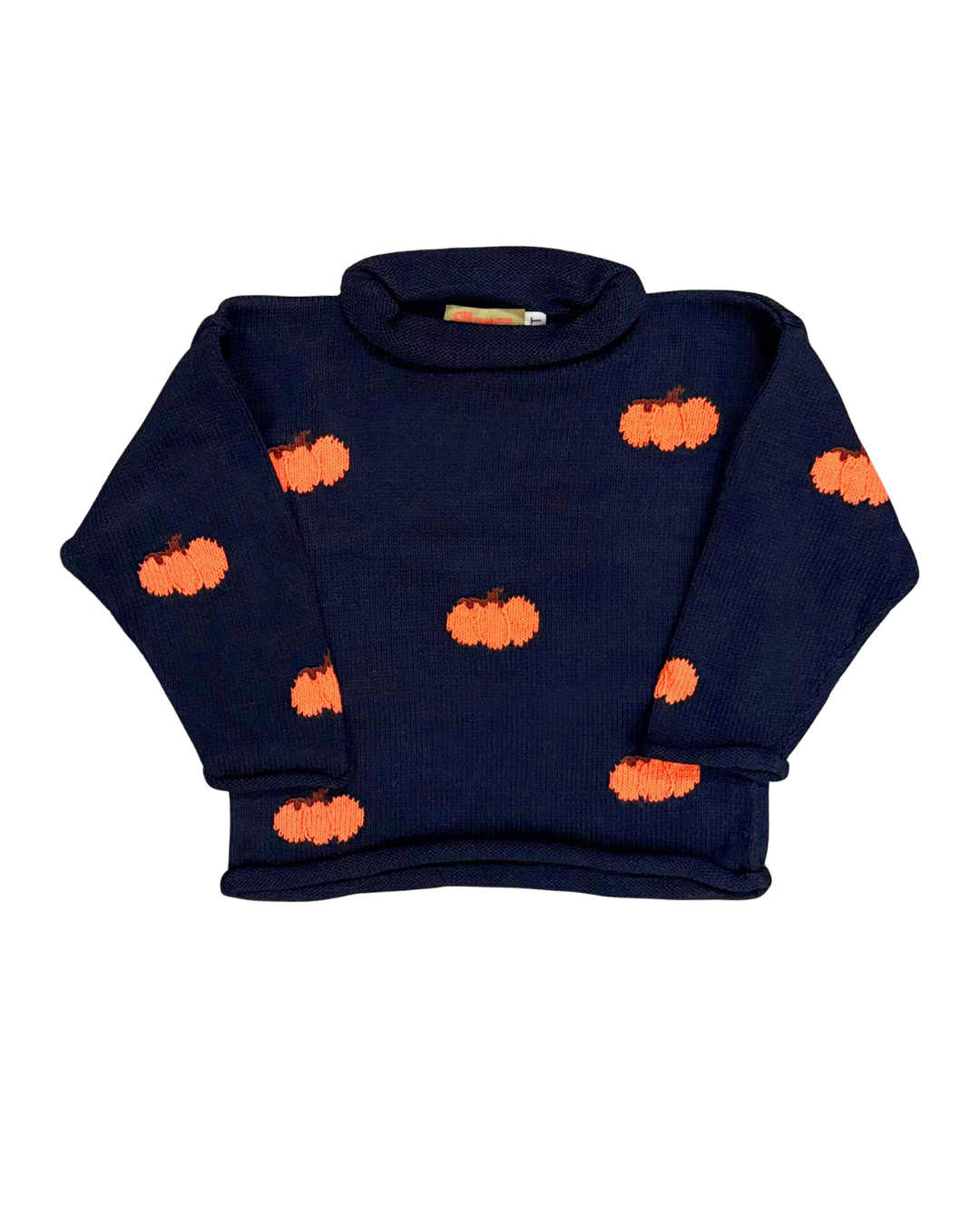 Bring fall fun to chilly days with this dark navy Peruvian cotton roll neck sweater from Claver by Acvisa. Soft and cozy, it features a scattered pumpkin design that adds a playful touch to your child's wardrobe. Perfect for Thanksgiving and wearing all fall long!