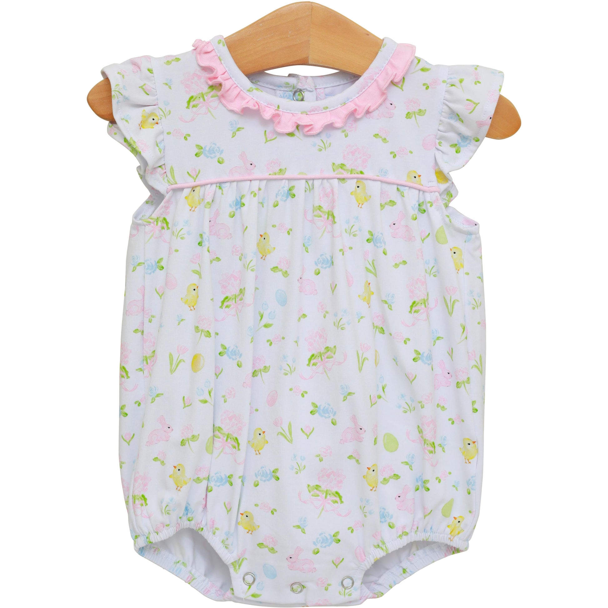 Hop into spring with this adorable bubble featuring a soft knit fabric adorned with sweet Easter prints and charming flutter sleeves. Perfect for Easter celebrations, playdates, or everyday adventures—your little one will love the cozy comfort and cheerful design.