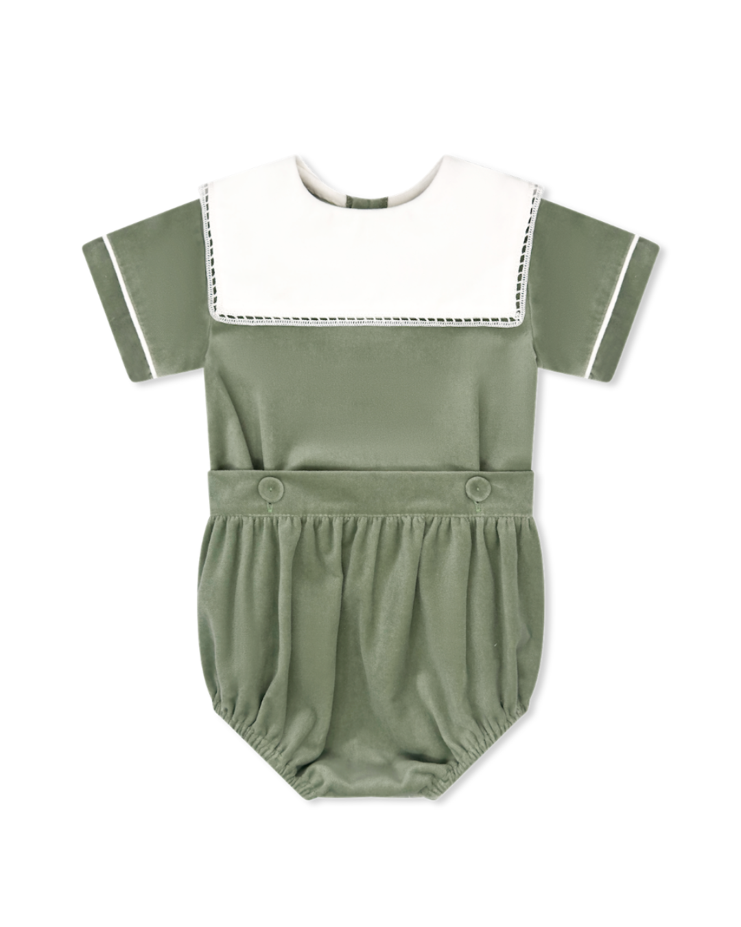 The sage green Leyland Velvet heirloom Christian Button On Bubble by Lullaby Set is expertly designed for holiday gatherings and family portraits. Crafted from sumptuous velvet, it offers a refined texture and classic silhouette that photograph beautifully. This timeless outfit combines comfort with elegant style, making it an exceptional choice for memorable seasonal celebrations and cherished family moments.