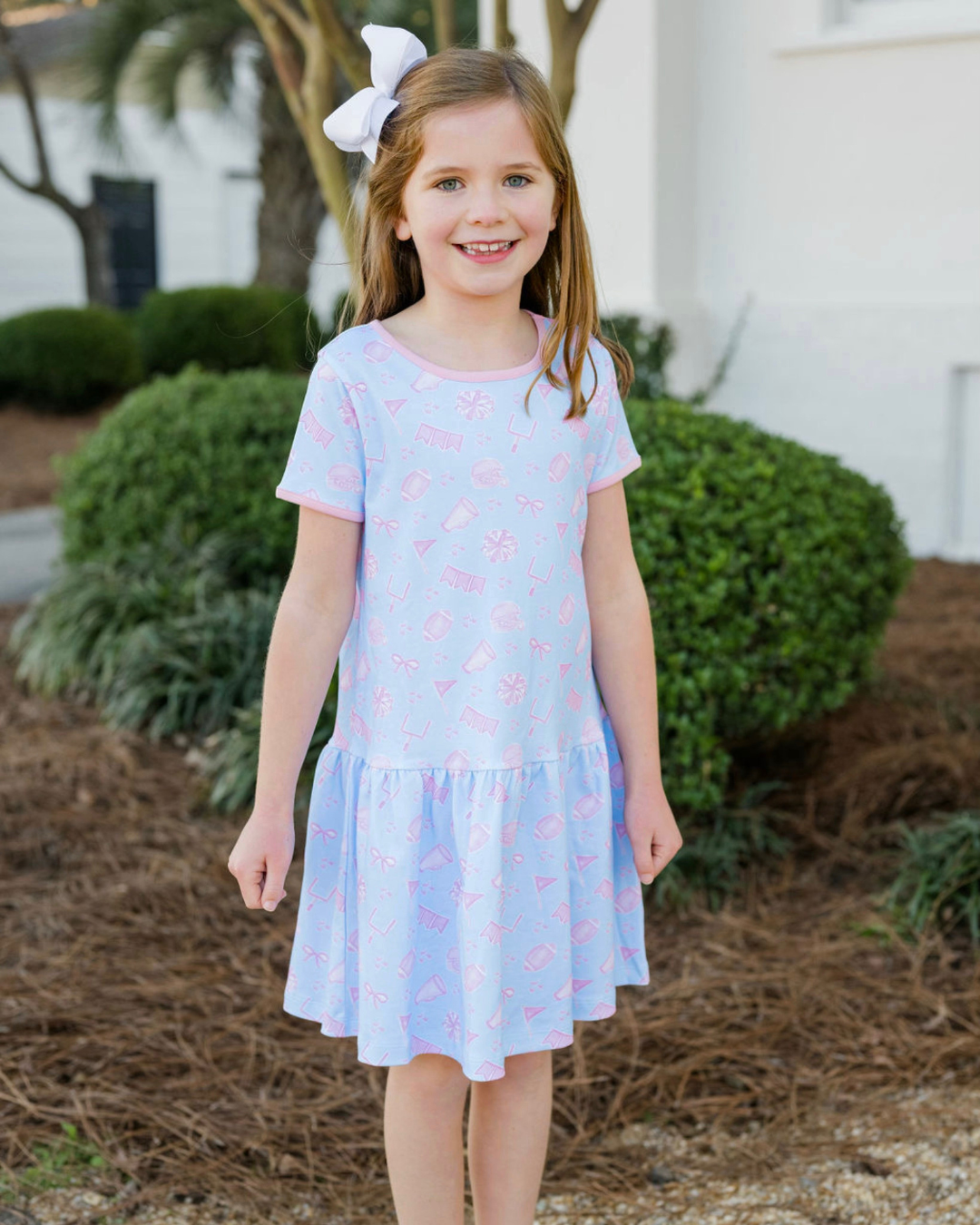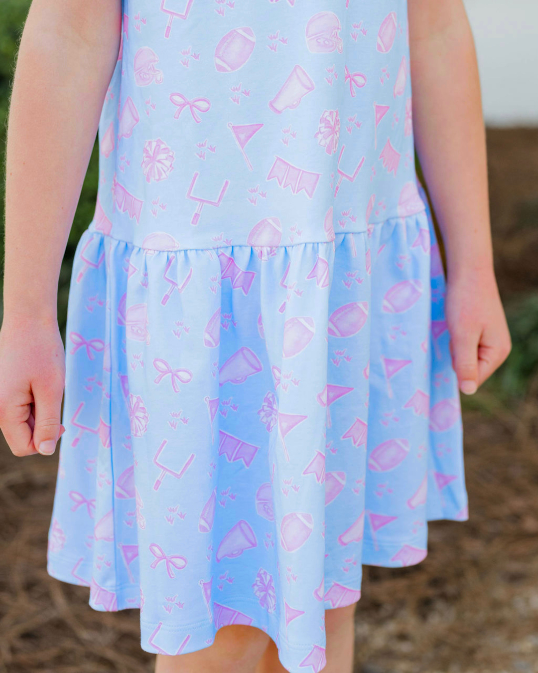 Celebrate football season in style with the Loren Dropwaist Dress in Game On Knit. This playful dress combines blue knit fabric with a fun pink design, making it perfect for cheering on the team or enjoying game day festivities. Comfortable and cute, it’s a winning choice for little fans ready to show their spirit.