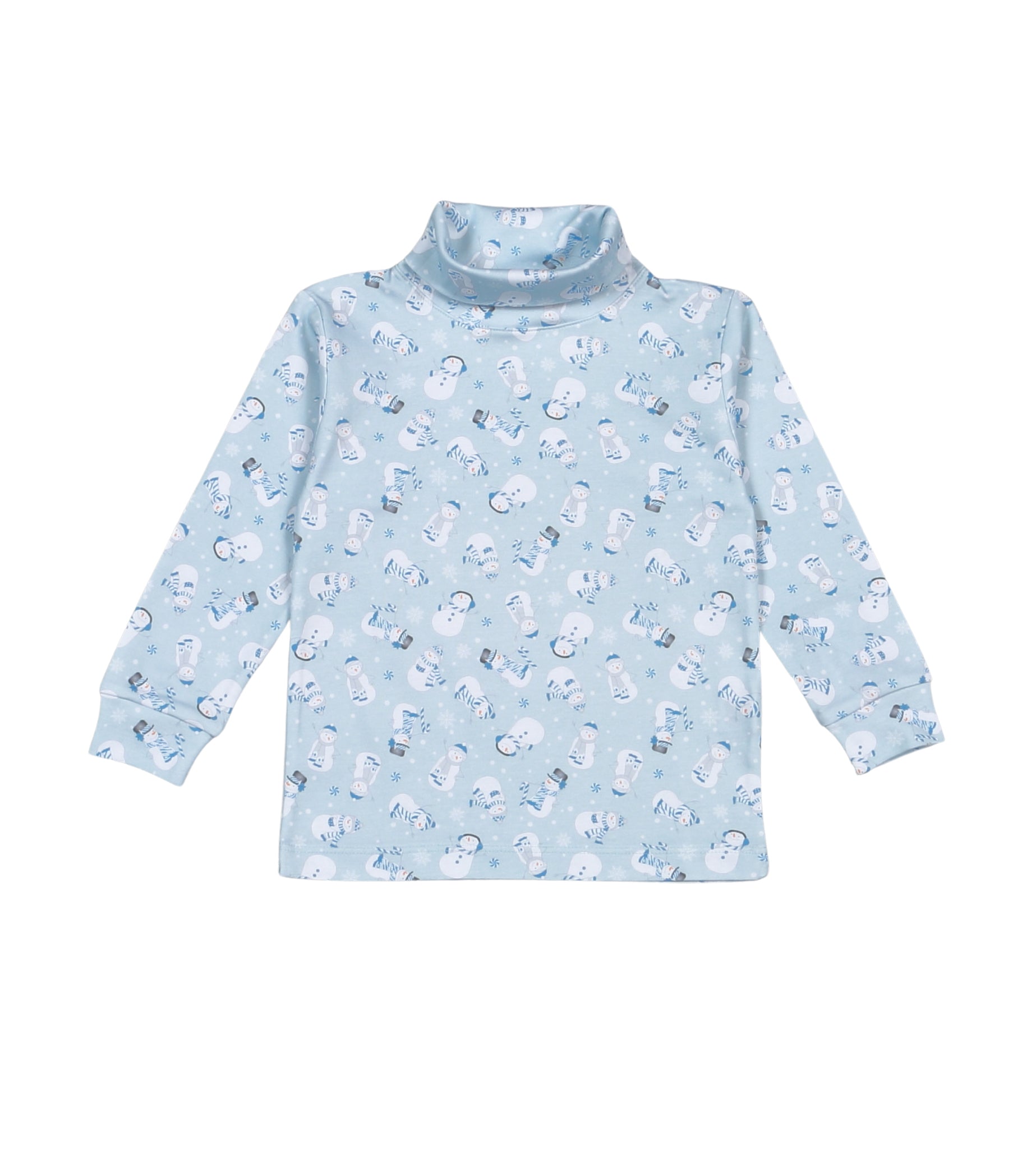 Cozy up in the Polar Pals Blue Pima Turtleneck, featuring an adorable snowman print on a soft light blue backdrop. In ultra-soft pima cotton, it's perfect for keeping little ones comfy and cheerful all day long.