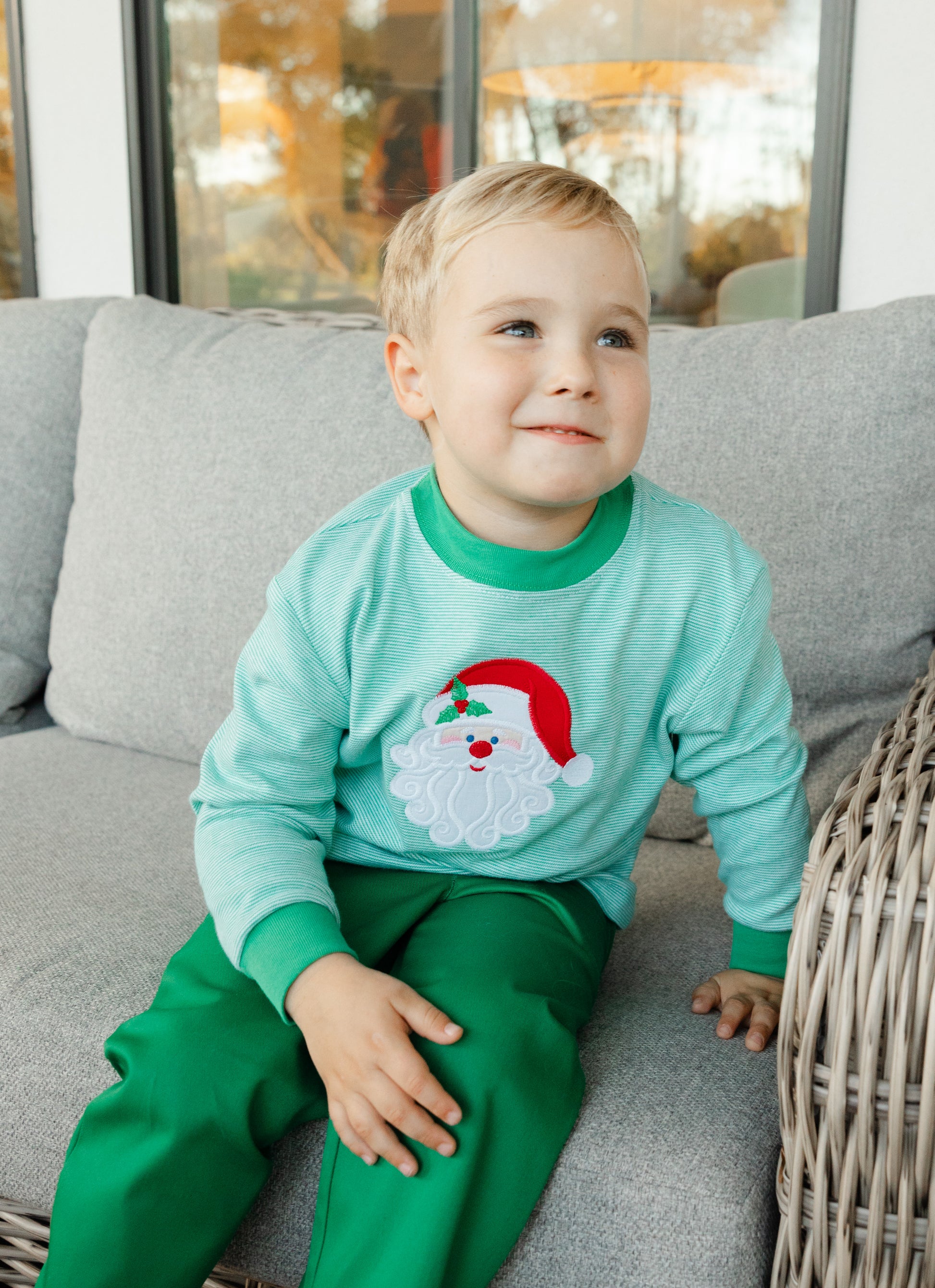 Get your little one holiday-ready with this playful Santa Pant Set from The Bailey Boys featuring a green striped top adorned with a cheerful Santa face and matching solid green pants—perfect for festive fun and cozy comfort all season long!