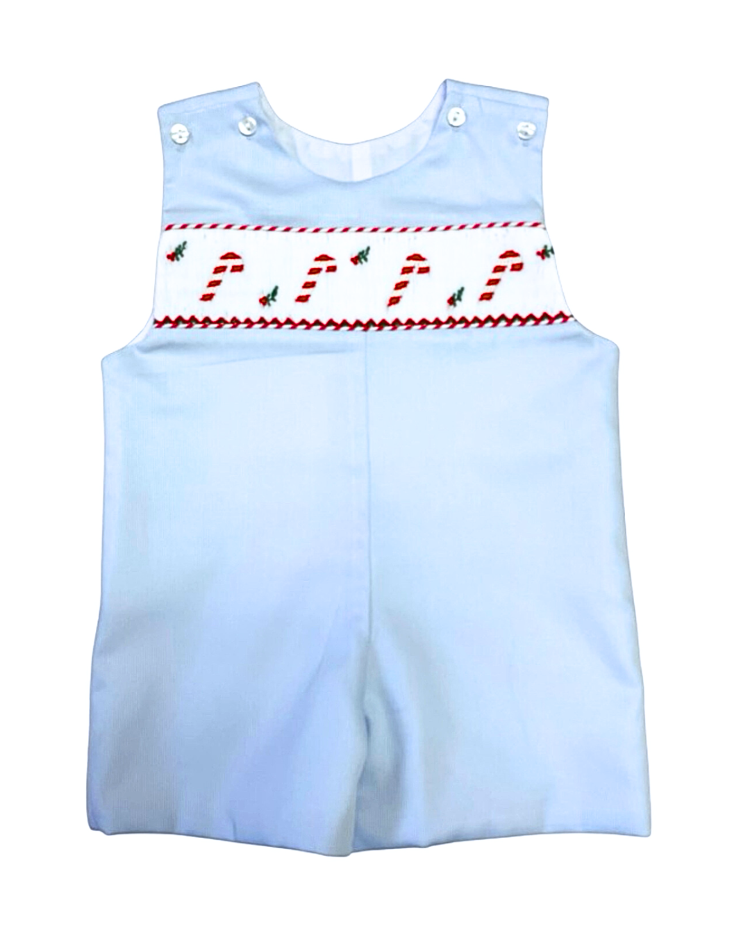 Crafted from a soft light blue woven fabric, this Smocked Candy Cane Pete Shortall from Lulu Bebe features a charming candy cane smocked design perfect for festive occasions. Its classic shortall style offers easy layering and movement, making it both stylish and practical for your child's holiday wardrobe.